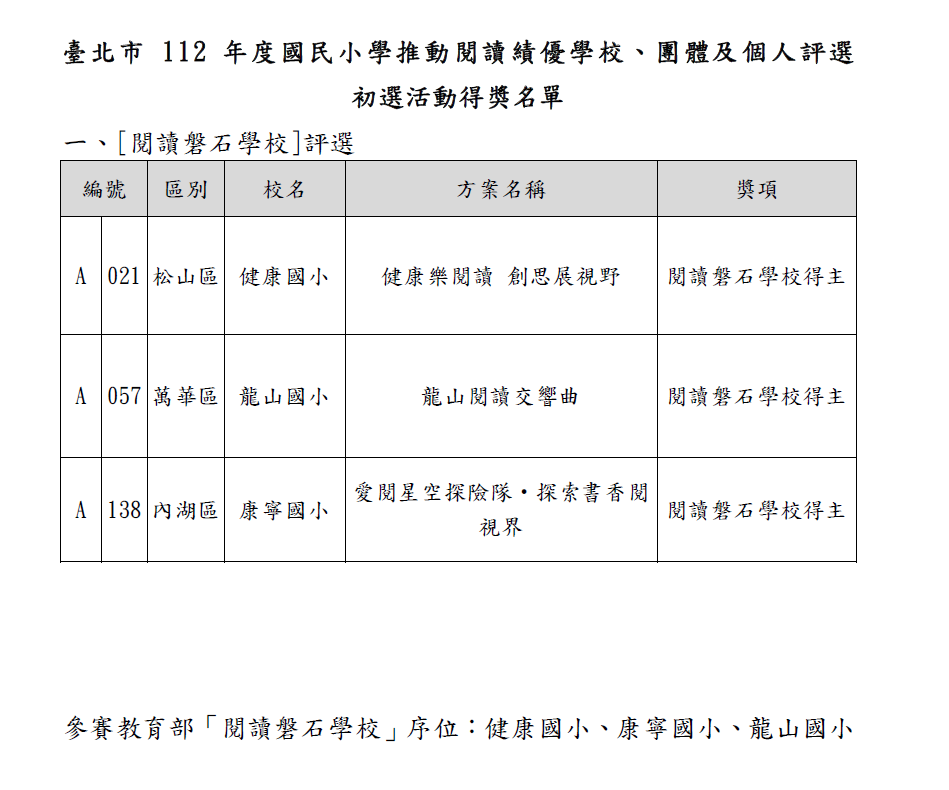 經臺北市112年度國民小學績優學校評選及實地訪視,獲選為臺北市「閱讀磐石學校」獎項。