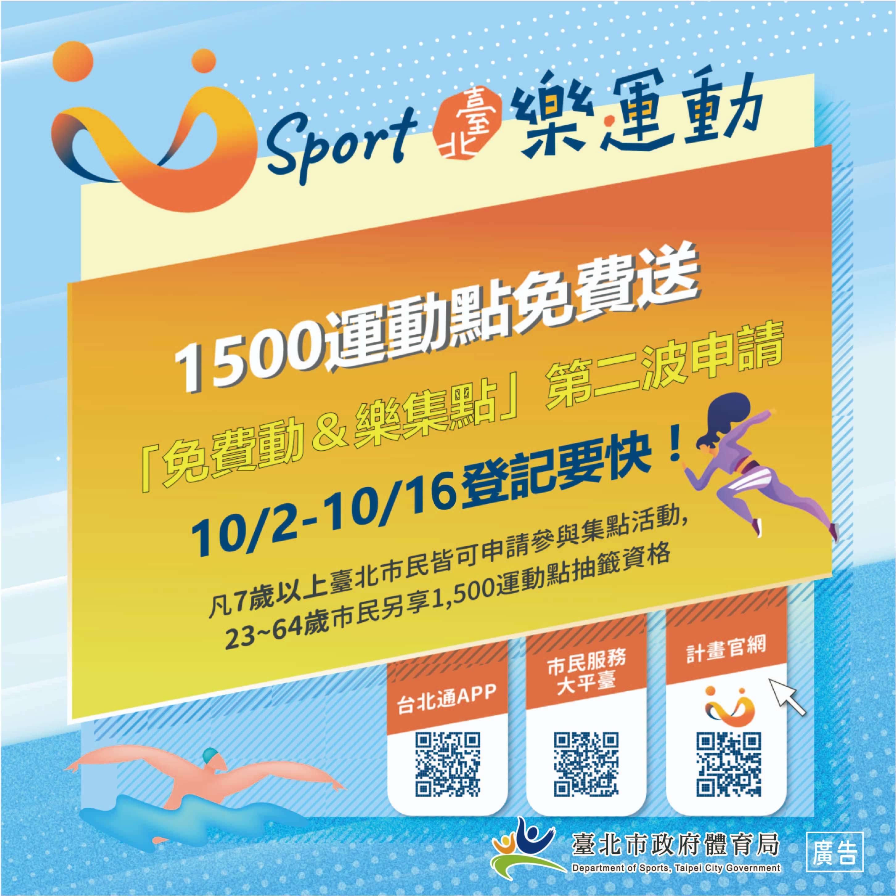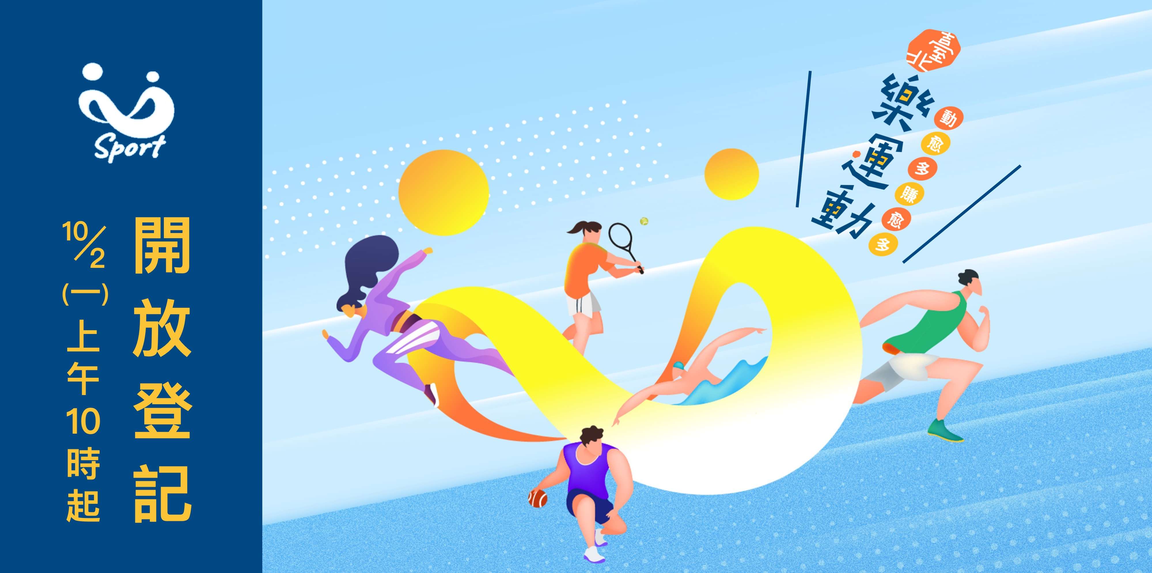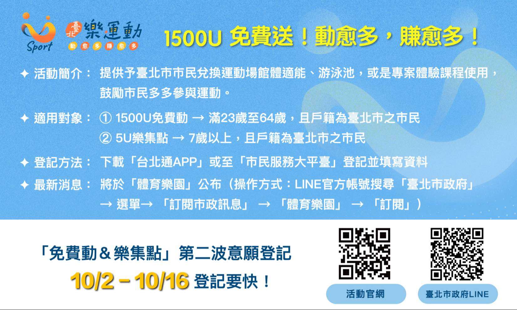 「U-Sport臺北樂運動第二波登記!」10/2上午10點-10/16上午10點透過台北通APP或市民 服務大平台登記,活動訊息請見官網或臺北市政府Line官 方帳號-體育樂園 。