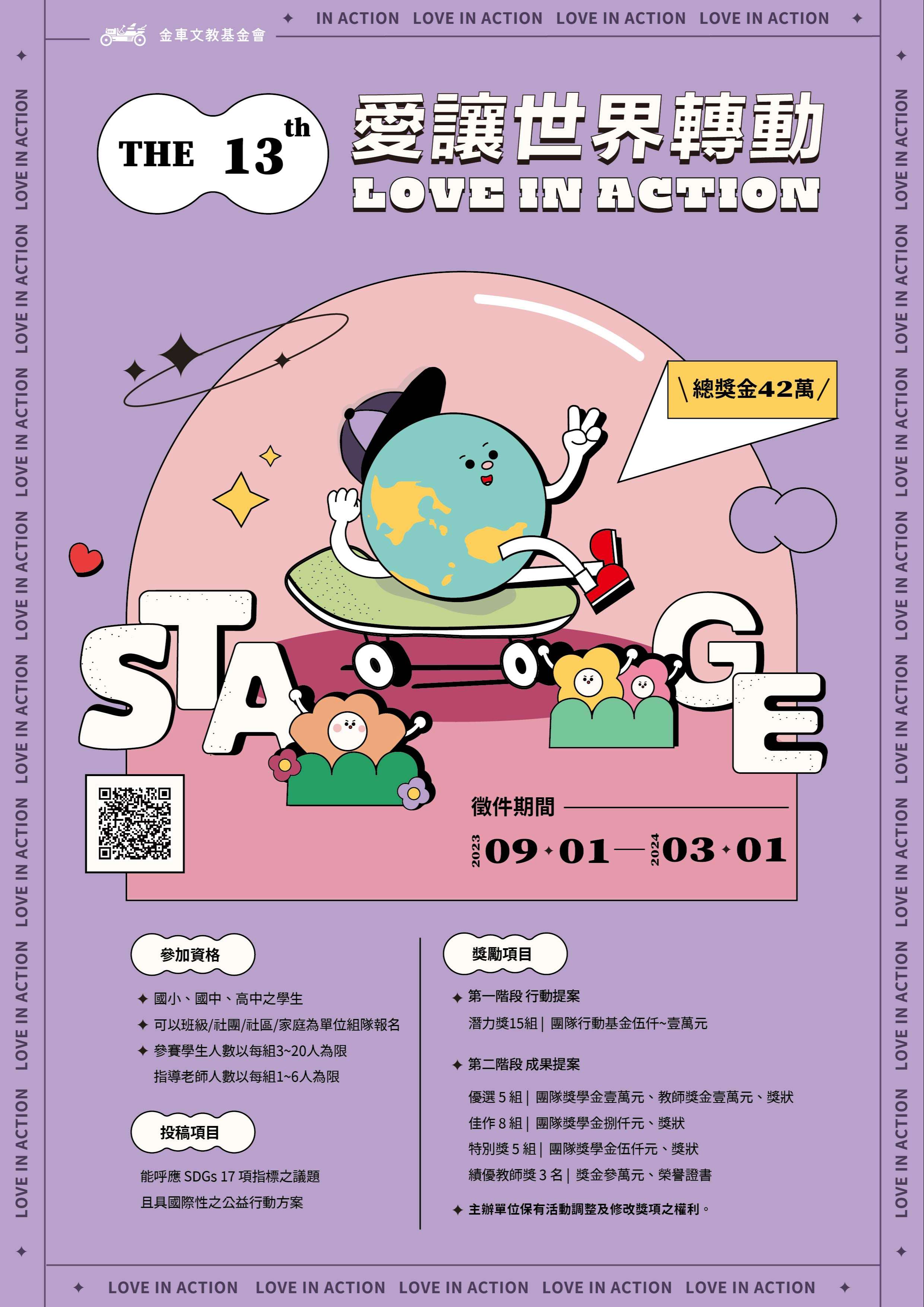 一、金車文教基金會自2011年開始舉辦「愛讓世界轉動 兒少公益行動」徵 選,以STAGE行動步驟為基礎,從發現問題、創意思考、行 動實踐到收穫反思,鼓勵青年學子以國際視野落實在地行 動,培育下個世代成為具備同理心、行動力及團隊溝通力 之世界公民。
