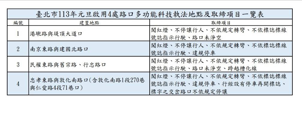 臺北市政府警察局今 (112)年於4處路口建置「路口多功能交通違規科技執法設備」,並依據各路口違規態樣採行「多行向、多功能」 違規項目取締,科技執法設備規劃於113月1月1日正式啟用,113年元旦啟用4處路口科技執法一覽表如附件。