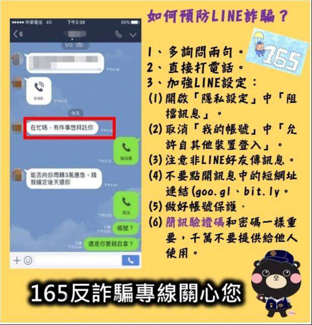 1.近期「盜(冒)用LINE帳號」詐騙手法頻傳,受騙民眾收 到親友傳來LINE訊息,對方稱急需用錢欲向民眾借錢,民 眾將錢匯到對方指示的銀行帳戶後,發現對方LINE帳號遭 盜用,驚覺遭詐。