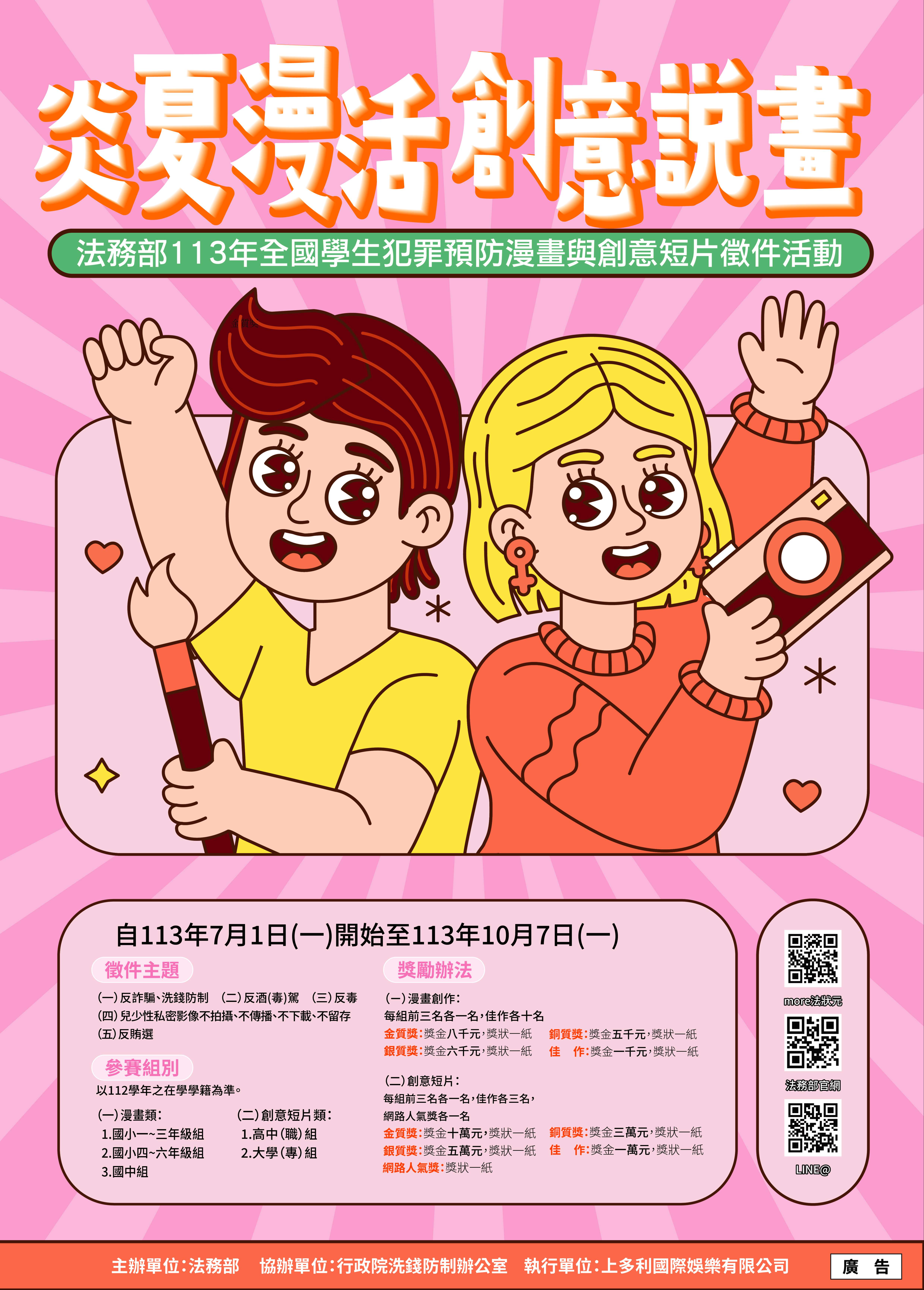 二、徵稿期間自113年7月1日至10月7日,採線上報名,有關徵 稿活動相關訊息及報名資料下載,請於7月1日至下列網站 搜尋:活動官網(https://www.mojgov2024.com.tw/)、 法務部「More法狀元」網站(https://tpmr.moj.gov.tw)「年度活動」或facebook搜尋:More法狀元-兒童及青 少年犯罪預防宣導網。