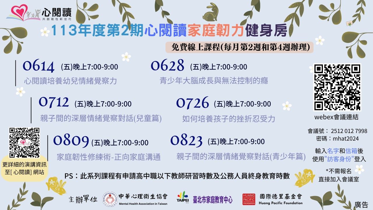 心閱讀持續與臺北市青年發展暨家庭教育中心合作辦理系列與家庭相關的議題,為持續為增長家庭韌力,特辦理系列家庭健身房的課程。