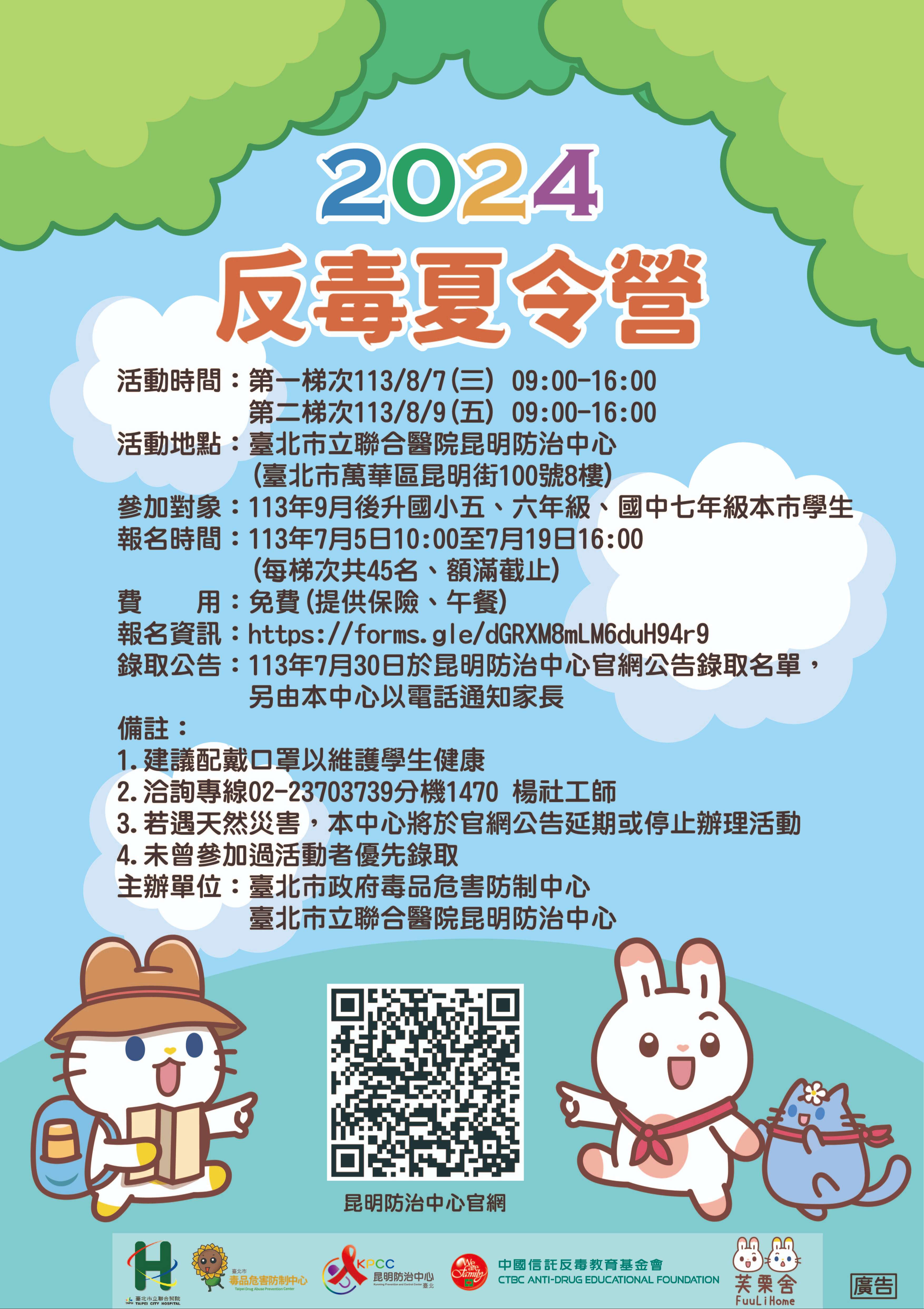八、檢附營隊宣傳海報一份,請協助公告宣傳,報名資訊可至 昆明防治中心官網查詢(https://tpech.gov.taipei /mp109231)。