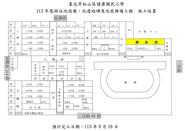 二樓游泳池將僅剩部分鋪面、上漆維護等工項,大型機具不會進入校園,也不會有噪音干擾,工區以圍籬區隔,施工人員進出配戴施工證,以維護學生學習之穩定及安全。