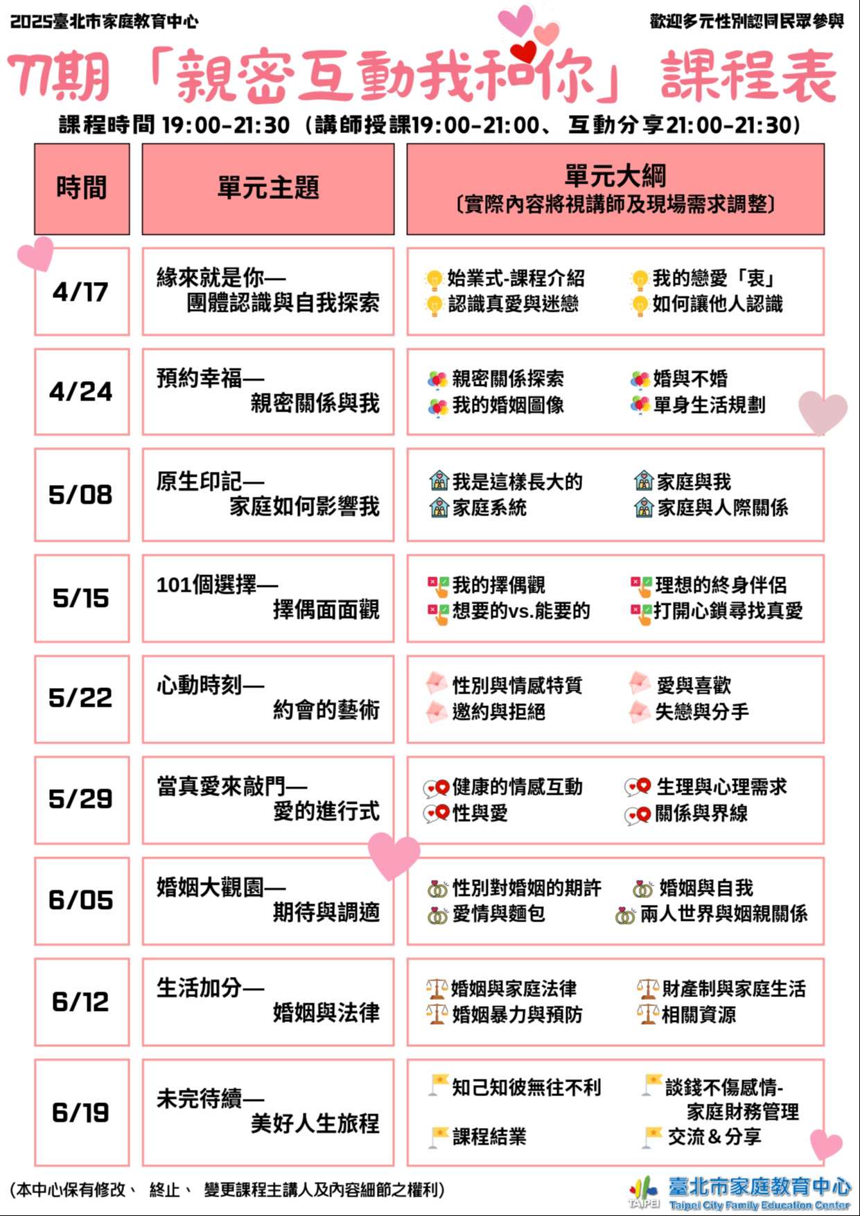 歡迎參加臺北市家庭教育中心於4至6月舉辦之 「親密互動我和你」情感教育系列課程