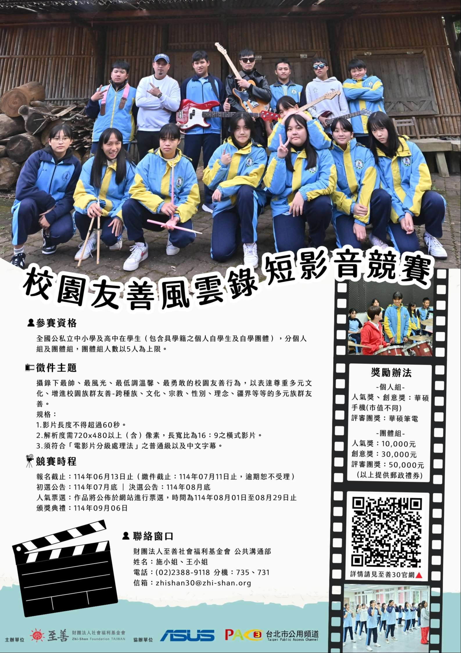 一、基金會(官網:https://www.zhi-shan.org/)長期從事 亞洲4地兒少發展工作,為響應「兒童權利公約」(CRC) 中禁止歧視原則,自2023年起倡議「校園族群友善」,已 連續兩年舉辦校園族群友善獎。該會將辦理「校園友善風 雲錄-短影音競賽」,邀請全國國小至高中學生共同參 與,促進校園友善。