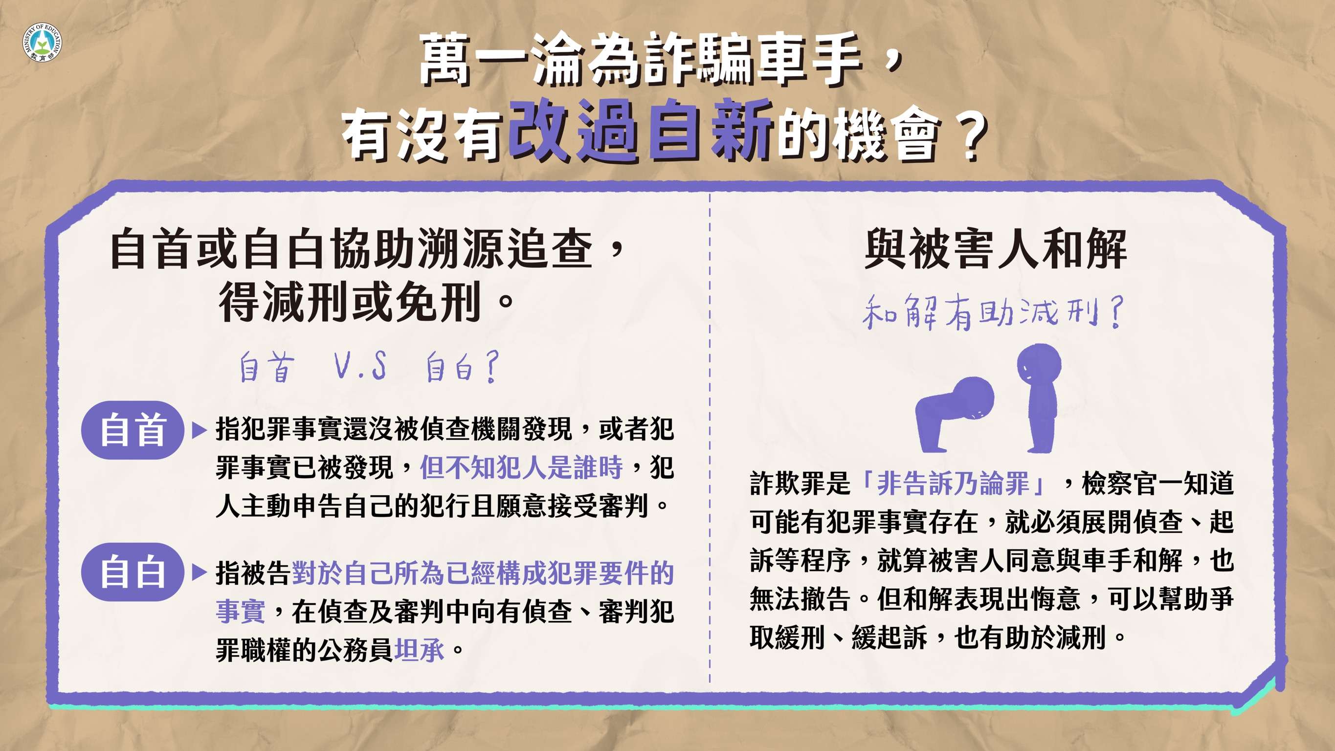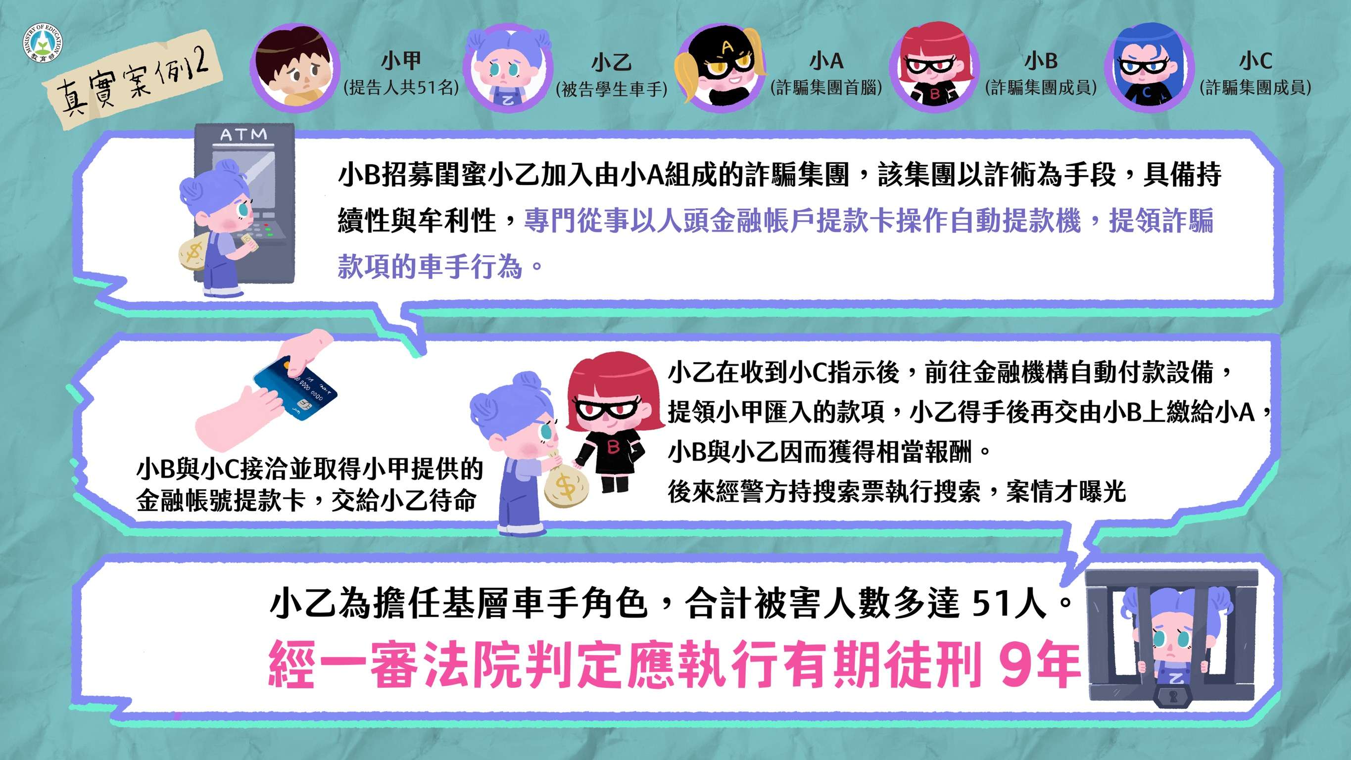 近年來學生擔任車手涉詐欺案件數攀升,尤以12至23歲涉 案最多,教育部藉由真實案例,解析學生擔任詐騙車手所 可能承擔的法律責任,製作本案懶人包,避免學生遭不法 分子利用,衍生後續的法律風險與責任。