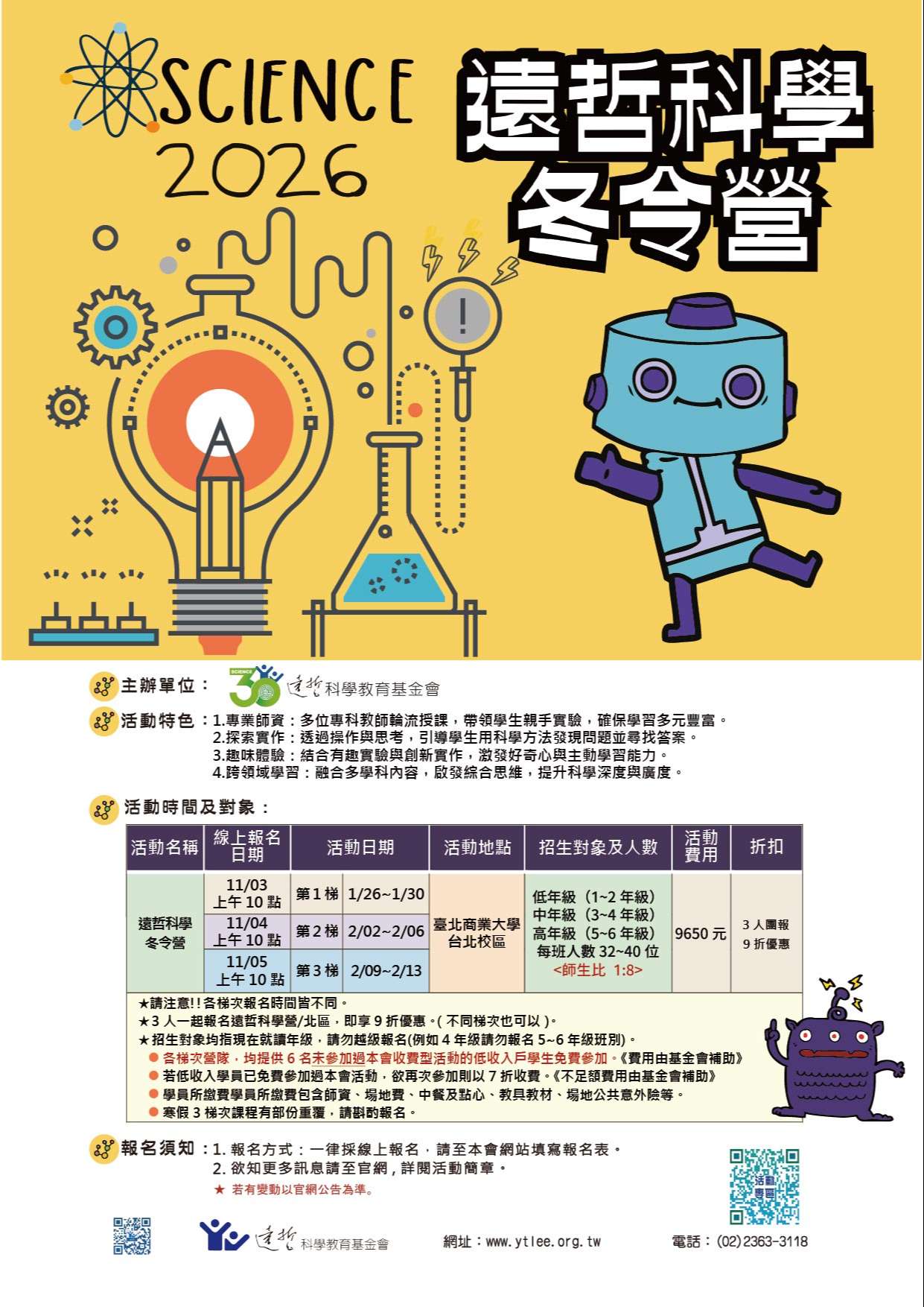 二、活動訂於民國115年1月26日至2月13日,假國立臺北商業大 學舉辦三個梯次之遠哲科學冬令營。