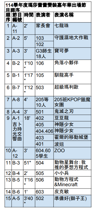 時間以表訂為原則~~家長們請參考順序表!!!!